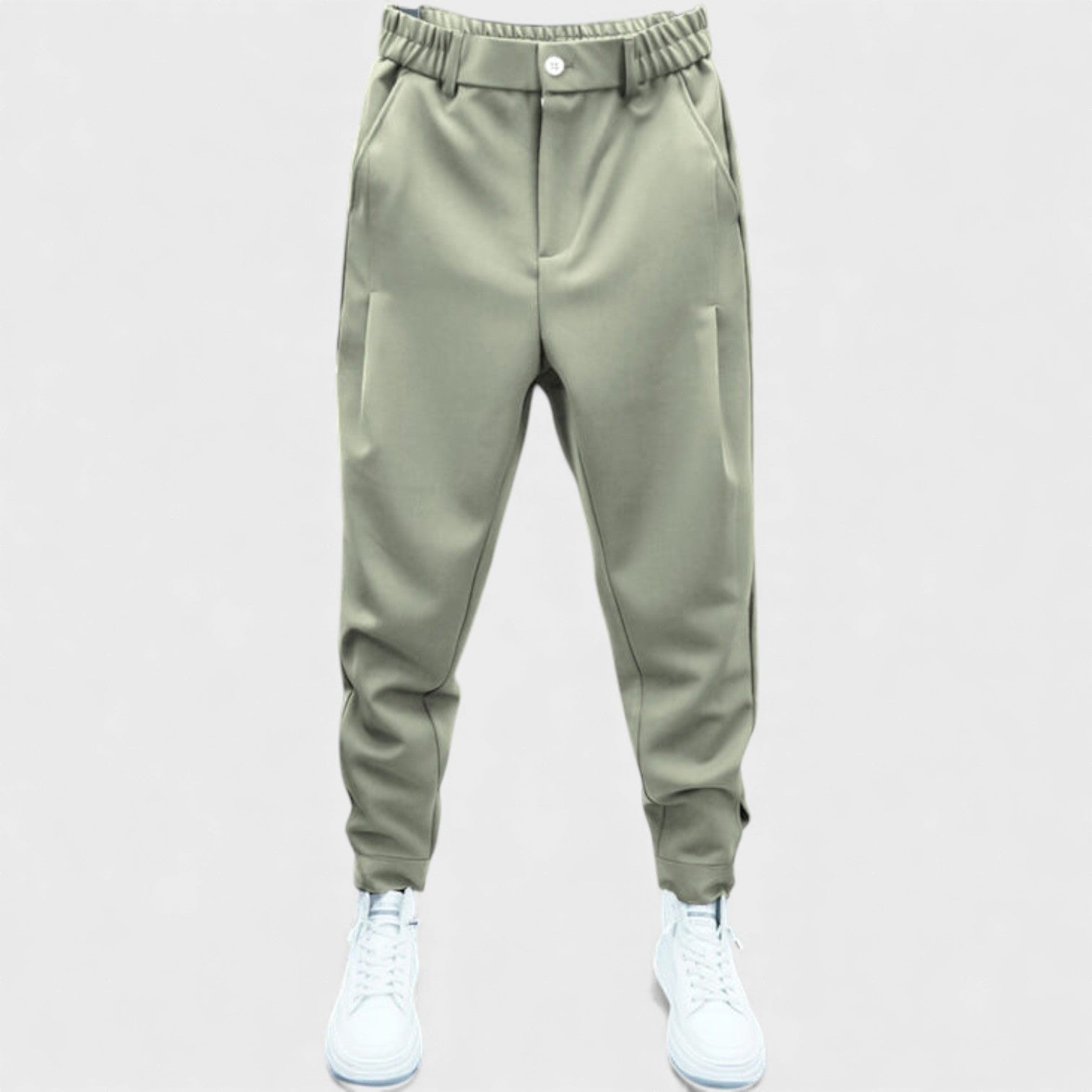 El pantalón Morris se caracteriza por un diseño moderno y minimalista, perfecto para aquellos que buscan un estilo sofisticado con un toque contemporáneo. Este pantalón de tela oscura y suave combina una silueta esbelta con detalles deportivos, como una cintura elástica con cierre de botones, que ofrece un ajuste cómodo y versátil. Los bolsillos laterales aseguran funcionalidad, mientras que el dobladillo cónico proporciona una línea clara que combina perfectamente con zapatillas deportivas o zapatos de noche.