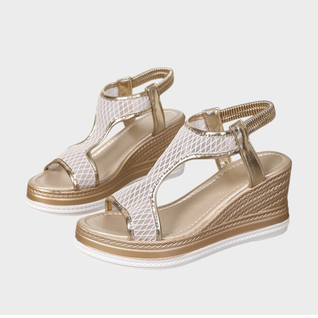 Esta sandalia combina elegancia y comodidad con un diseño moderno que combina tiras doradas y malla negra para un look sofisticado y transpirable. La plataforma añade altura sin sacrificar la comodidad, mientras que el tacón elástico garantiza un ajuste práctico y seguro. Detalles delicados, como las costuras y el acabado brillante, realzan el encanto de la pieza.