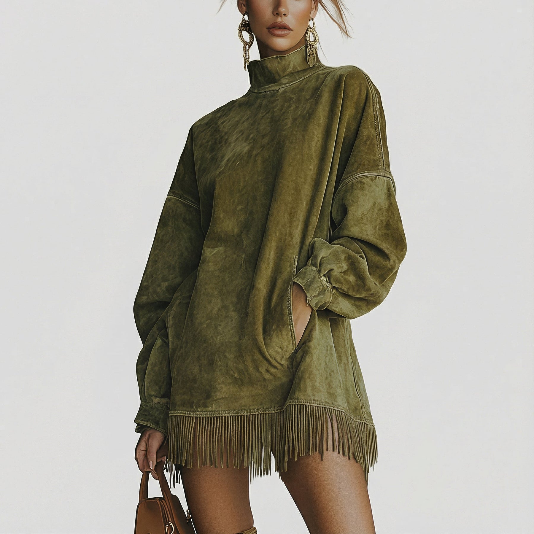 ADELA™ | Vestido de cuello alto de ante con flecos