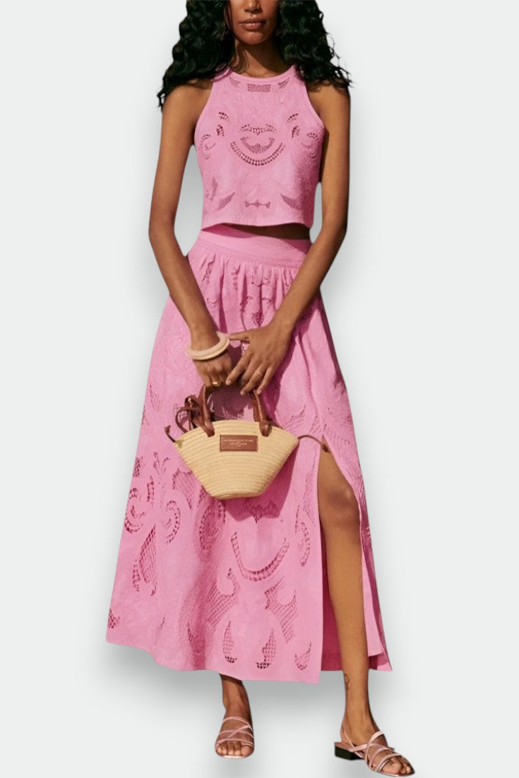 Confeccionado en un encaje delicado y sutilmente transpirable, su diseño fluido se adapta a tus movimientos con gracia. Ideal para paseos veraniegos, brunches al sol o eventos especiales, puedes llevarlo completo o combinar las piezas según tu inspiración del día. ¡Serás el centro de miradas con total naturalidad!